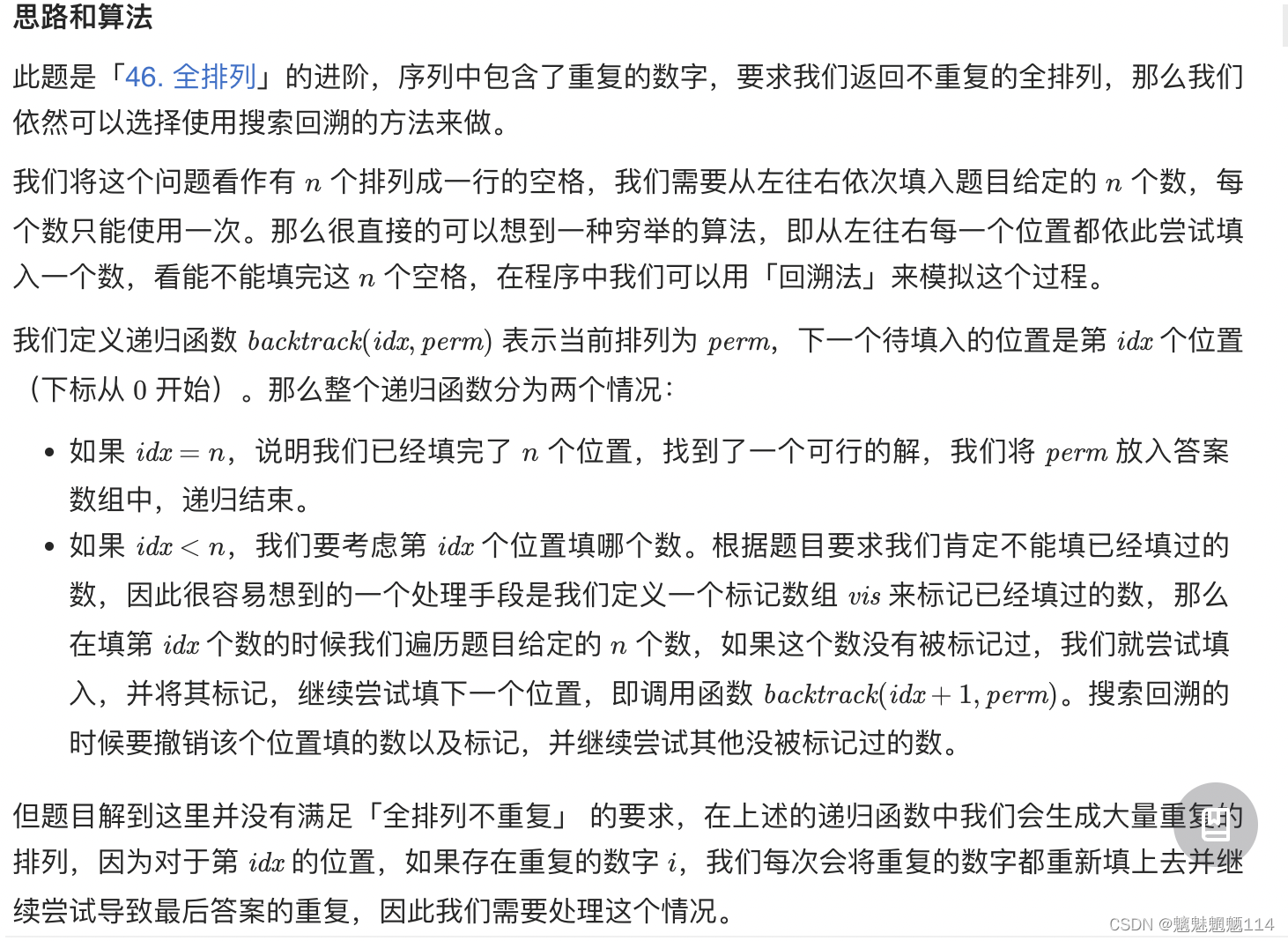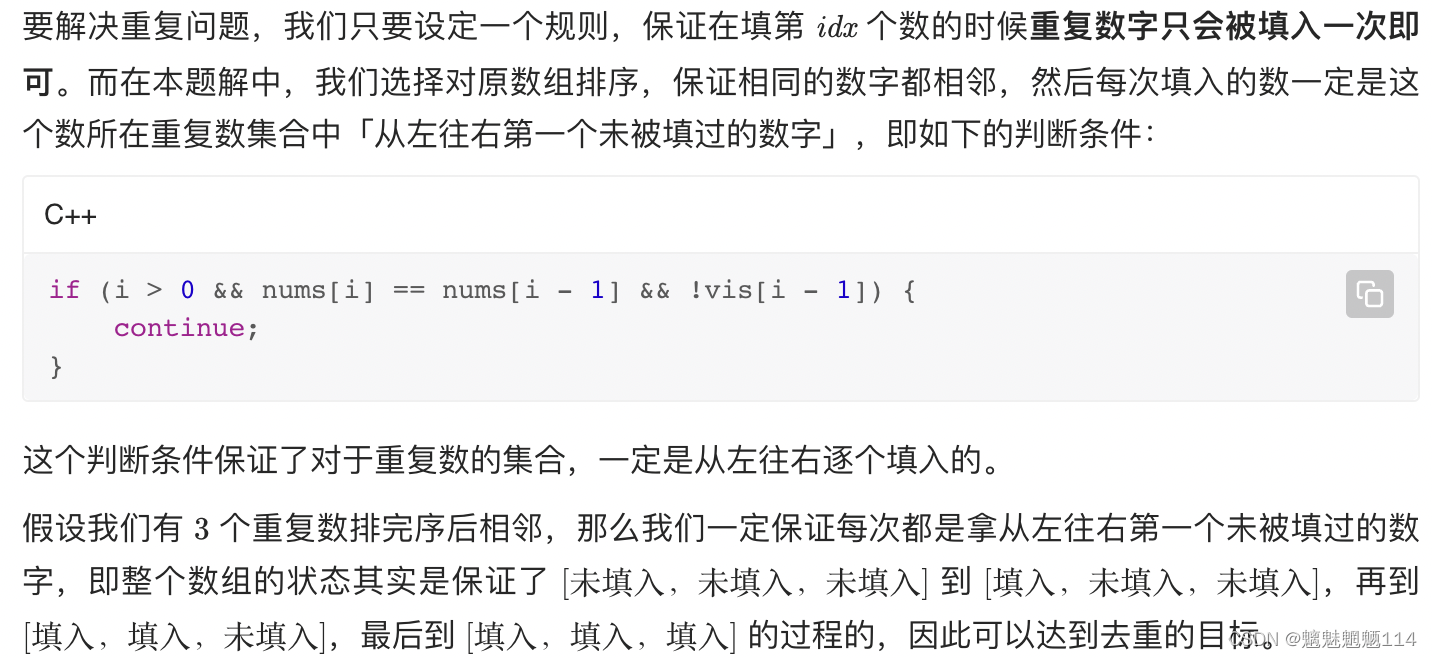 //nums[i] == nums[i-1] && used[i-1]==0 实现去重,重复元素中从非第一个访问时需要跳过,因为访问肯定会重复了