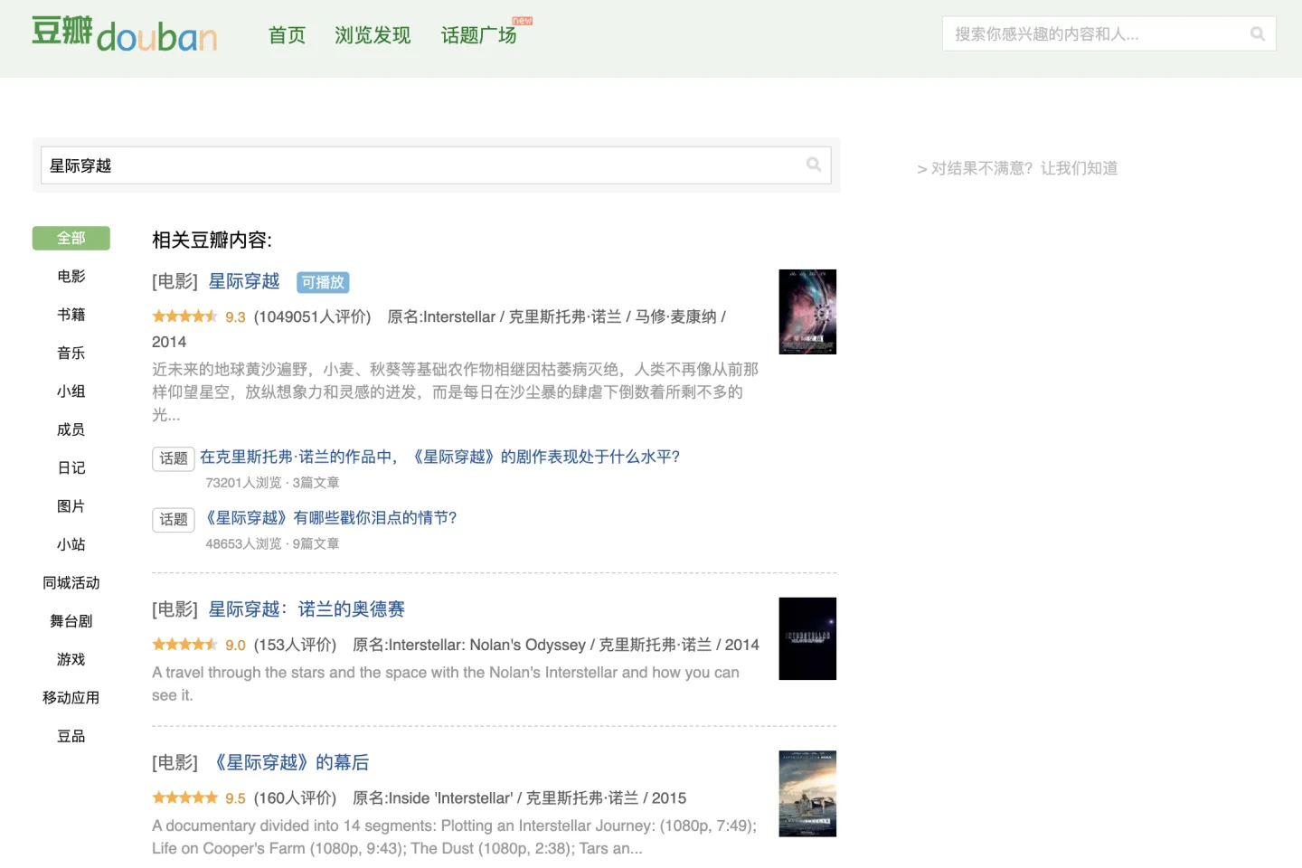 EXAMPLE 需求:豆瓣用户可在首页搜索框内输入关键词搜索感兴趣的内容。如在豆瓣搜索“星际穿越”。