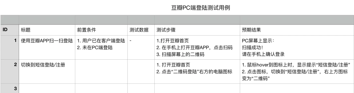 下面的示例是“豆瓣PC端登陆功能”的测试用例: