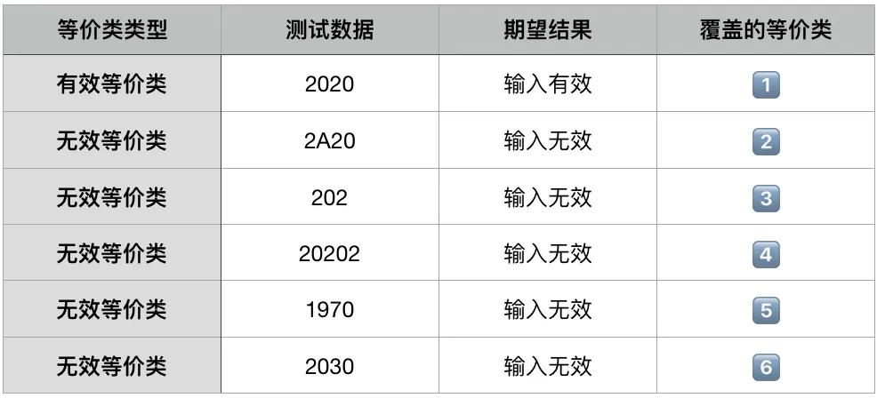 ⚠️ 注意:软件不仅要能接收合理的数据,也要能经受意外的考验。因此在划分等价类的时候不仅要考虑合理的、有意义的输入数据构成的集合,还要考虑不合理的或无意义的输入数据所构成的集合。我们将前者称为有效等价类,它能验证需求是否实现,后者则为无效等价类,能检验是否会出现异常。无效等价类至少应有一个,也可能有多个,视具体情况而定。