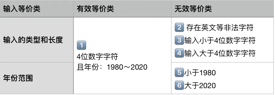 使用等价类划分法,首先确定有效等价类:4位数字字符且年份为1990~2020,然后确定无效等价类:如输入的类型和长度不合理,年份超出范围等,具体如下表所示: