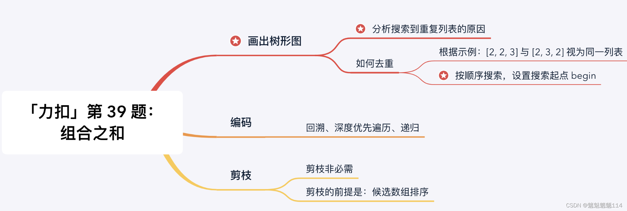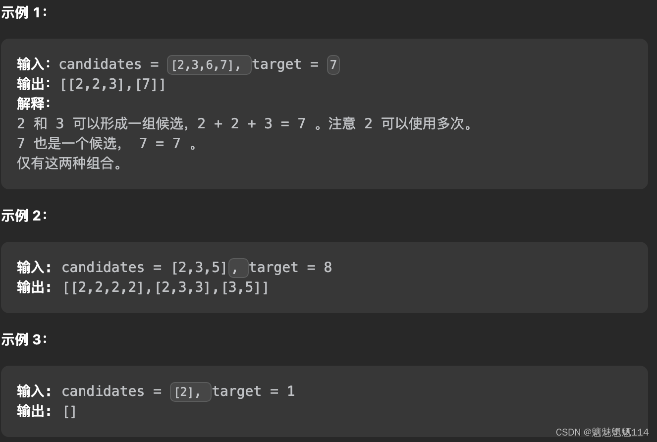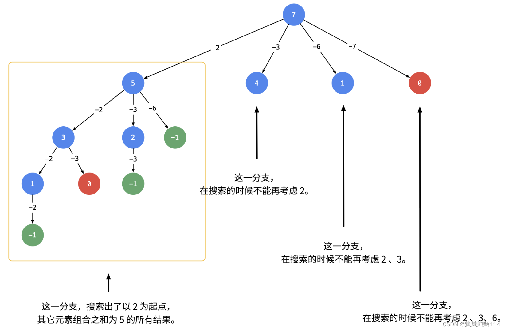 这棵树有 444 个叶子结点的值 000,对应的路径列表是 [[2, 2, 3], [2, 3, 2], [3, 2, 2], [7]],而示例中给出的输出只有 [[7], [2, 2, 3]]。即:题目中要求每一个符合要求的解是 不计算顺序 的。下面我们分析为什么会产生重复。产生重复的原因是:在每一个结点,做减法,展开分支的时候,由于题目中说 每一个元素可以重复使用,我们考虑了 所有的 候选数,因此出现了重复的列表。