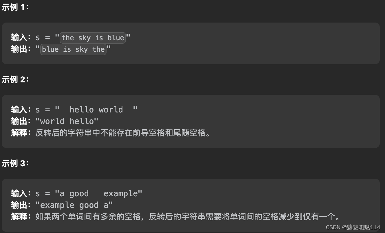 s中可能会存在前导空格、尾随空格或者单词间的多个空格。返回的结果字符串中,单词间应当仅用单个空格分隔,且不包含任何额外的空格。