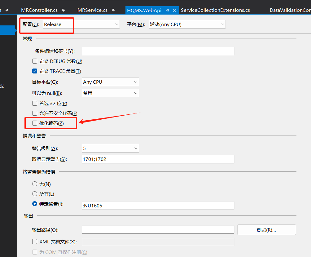 12、最后,记得把Release模式下的“优化编码”配置重新勾选上。重新发布成文件夹部署即可。