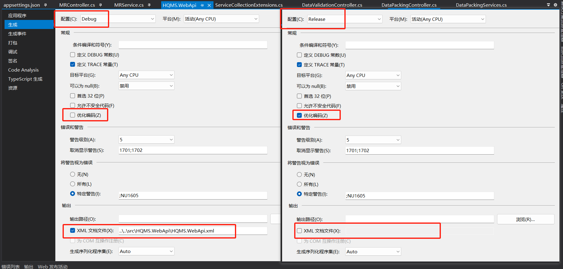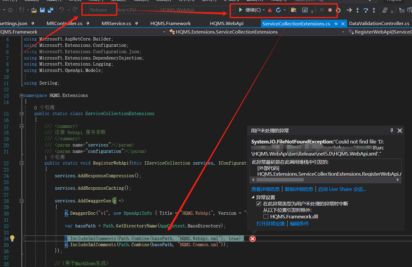 10、参考步骤6的图片配置,发现是swagger依赖的xml文件,在Release模式生成的时候,没有生成对应的xml,所以导致了报错。