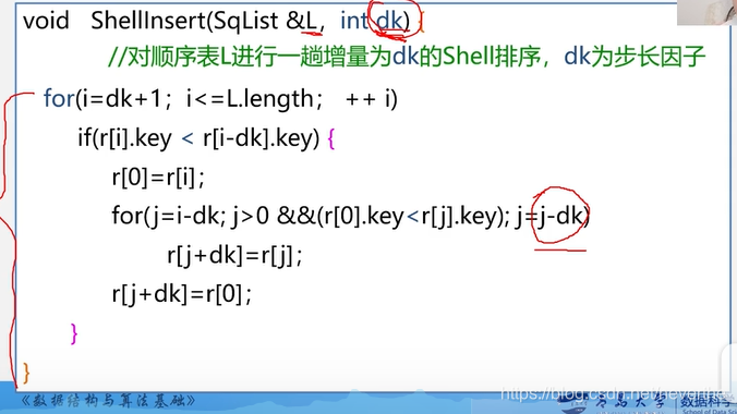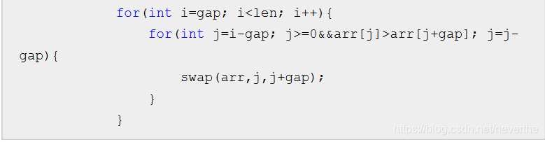 比如说{5,1,2},第一次时我们对5和1进行了排序,接下来我们跨组依次往后排序,此时到了2这个元素,那么我们用2减去增量,又到了5那个位置,将这2个数排好序,然后我们利用for循环再继续减增量,对这2个数再继续排序,,一直到减增量后的值小于0为终止条件,说明此时2以及2之前的5和1,这3个数已经彻底排好了序,如果说序列再足够长,等到有一个数减去增量后又等于2,那么再利用for循环对这4个数再依次进行排序。