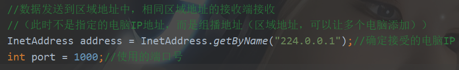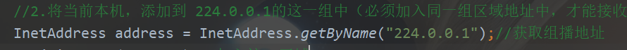 必须加入同一组区域地址中,才能接收到数据- InetAddress address = InetAddress.getByName("组播区域地址");