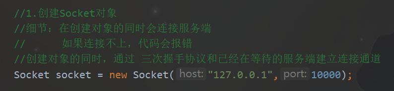 创建对象的同时,通过 三次握手协议和已经在等待的服务端建立连接通道,如果连接不上(没有开启接收端),代码会报错