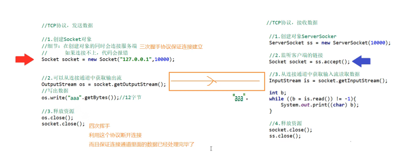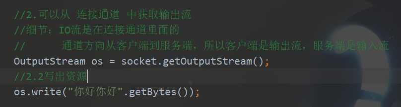 细节2:IO流是在连接通道里面的。 通道方向从客户端到服务端,所以客户端是输出流,服务端是输入流