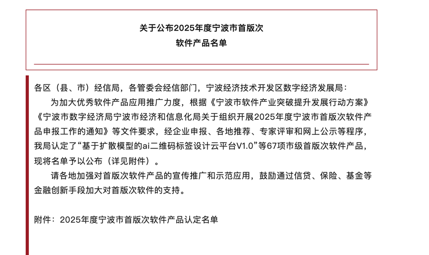 近日,宁波市数字经济局、宁波市经济和信息化局联合完成 2025 年度市级首版次软件产品认定工作,经企业申报、各地推荐、专家评审及网上公示等多环节严格审核,最终认定67 项产品为市级首版次软件产品。