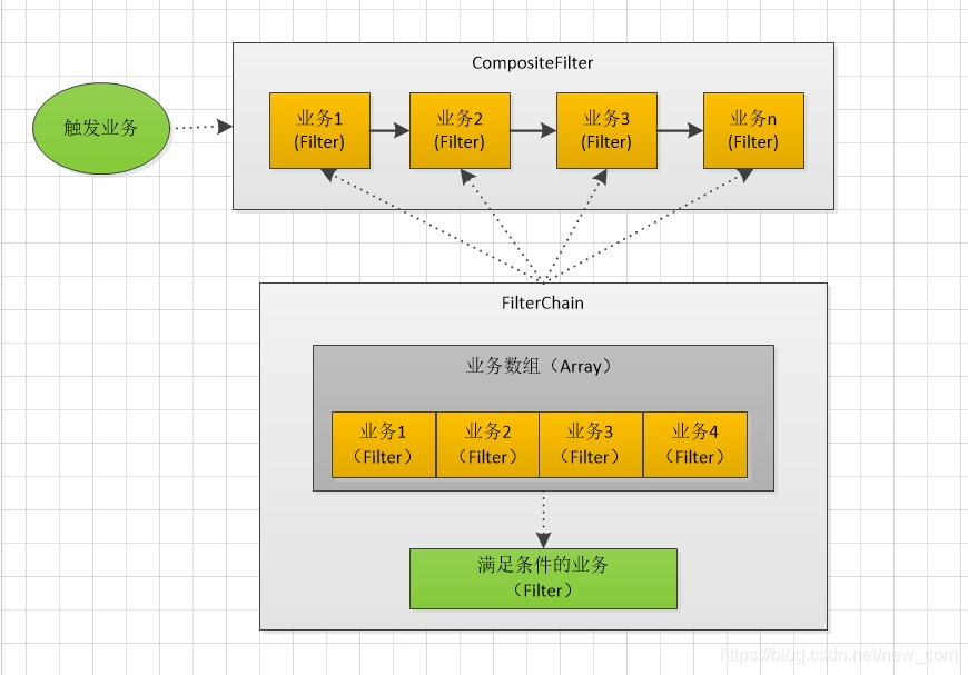在tomcat中,对于Http请求通常会进行用户身份的校验,权限的验证,日志处理等等业务的拦截和过滤。模仿tomcat实现的伪代码,定义Filter接口实现过滤业务的封装,CompositeFilter定义一组的过滤逻辑处理集合,FilterChain决定每次执行的FIlter的选择逻辑,每次执行时,从条件过滤组中筛选满足条件的过滤器Filter进行。过滤器链执行流程的大致如下: