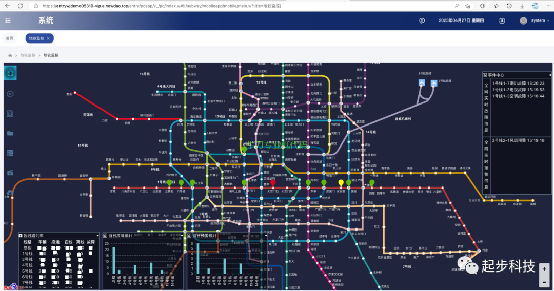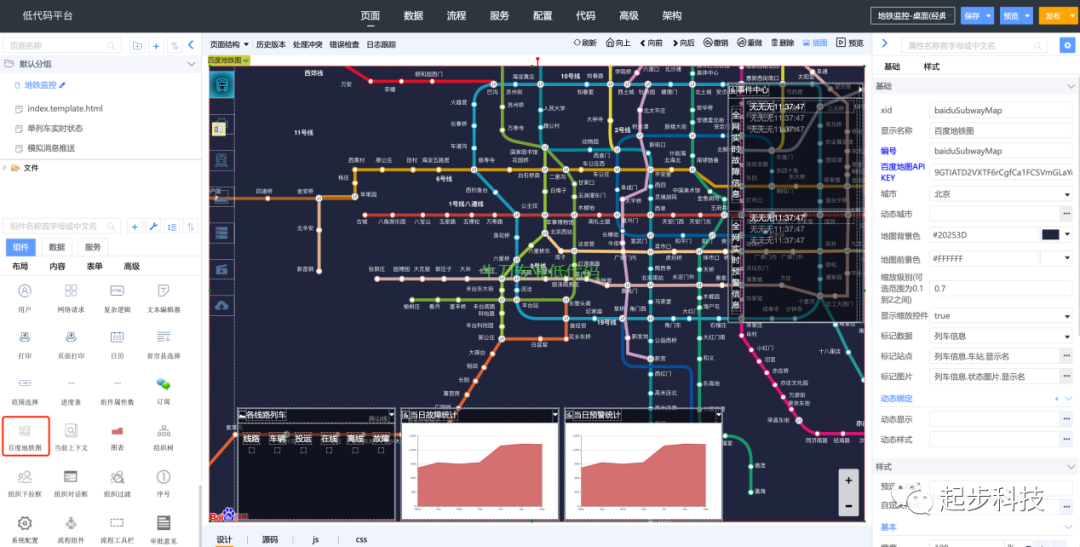 在地铁运行监控示例中,基于牛刀专业低代码平台的组件开发扩展能力,百度地铁图组件封装了来自百度的地铁图框架(https://lbsyun.baidu.com/index.php?title=subway)。基于扩展的百度地铁图组件,上面这个示例完全用组件拖拽可视化设计工具配置实现。