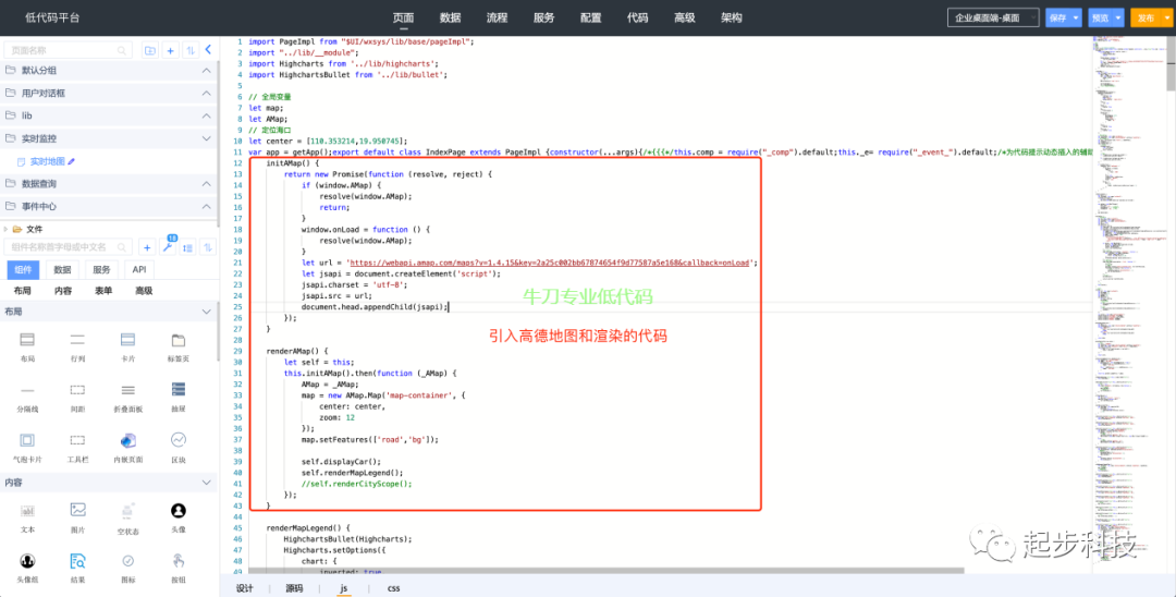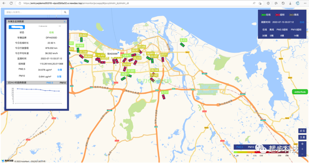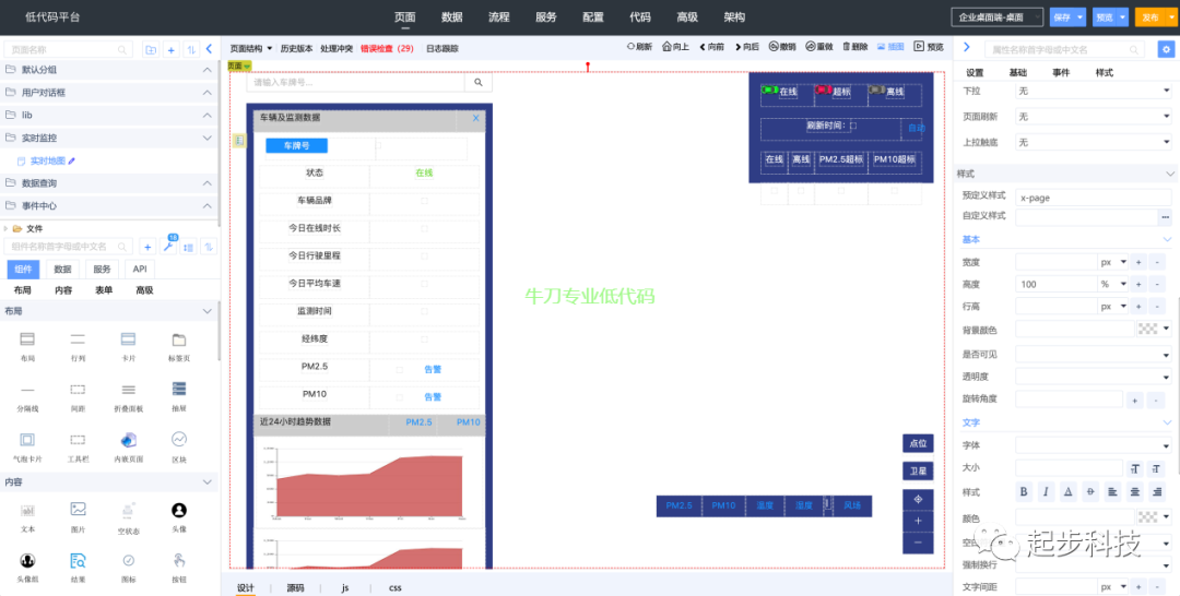 在物联网车载大气监测示例中,界面整体是通过低代码可视化设计来布局实现的,但是背后的地图通过代码引入了高德地图,并通过高德地图API的调用实现了地图上车辆位置的标注和交互。