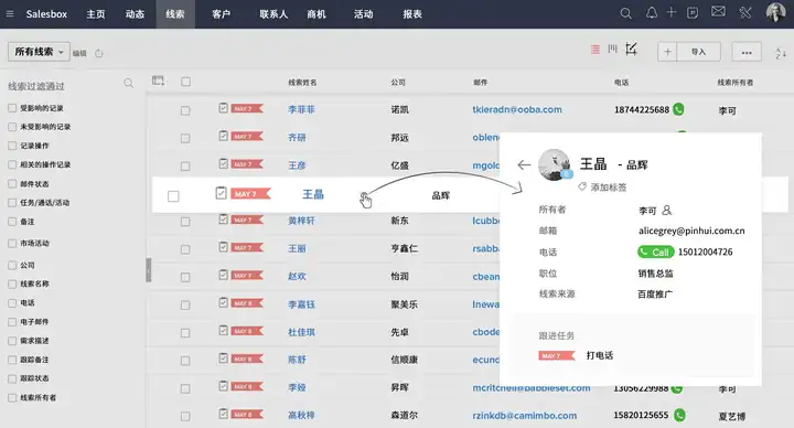 - 客户互动记录,包括电话、邮件、会议、备注等,完整追踪客户生命周期;