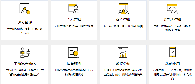 - 销售自动化:包括潜在客户管理、机会管理、任务和活动跟踪、销售预测等。