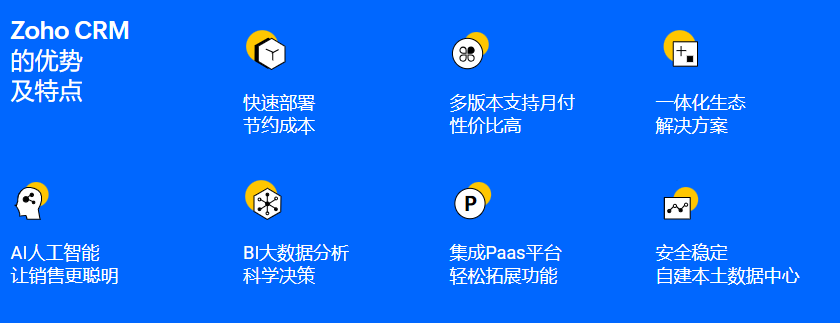 - AI助手(Zia):智能推荐、预测销售趋势、自动提醒等。