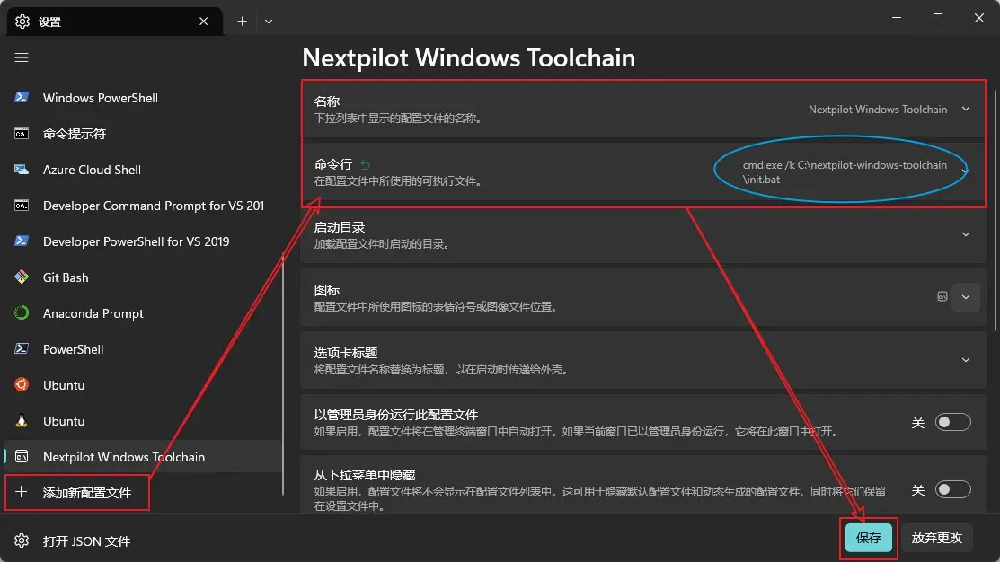 当然如果您已经安装 Windows Terminal,那么已将 NextPilot 添加到 Windows Terminal。打开Windows Termial > 设置设置页面,选择添加新配置文件,按照如下填写: