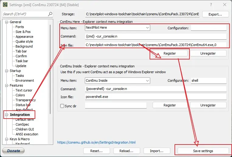 双击 Nextpilot-windows-toolchain/start.bat 脚本启动 ConEmu 终端,然后在 ConEmu > Settings... 设置页面,按照下图所示添加右键快捷菜单: