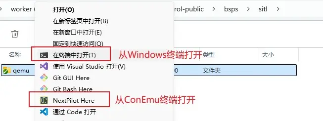 在 nextpilot 工程的 bsps 子文件夹中,比如bsps/sitl/qemu文件夹上点击鼠标右键选择NextPilot Here方式启动终端。