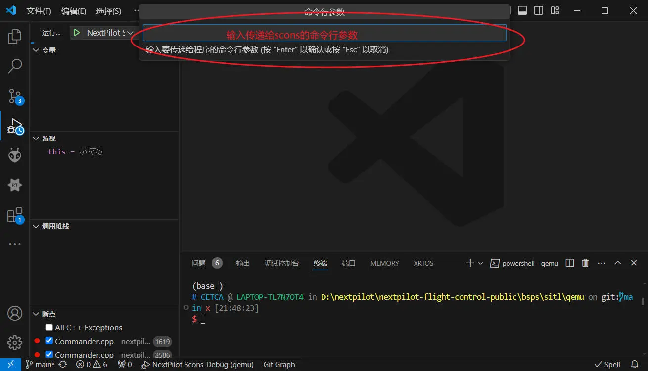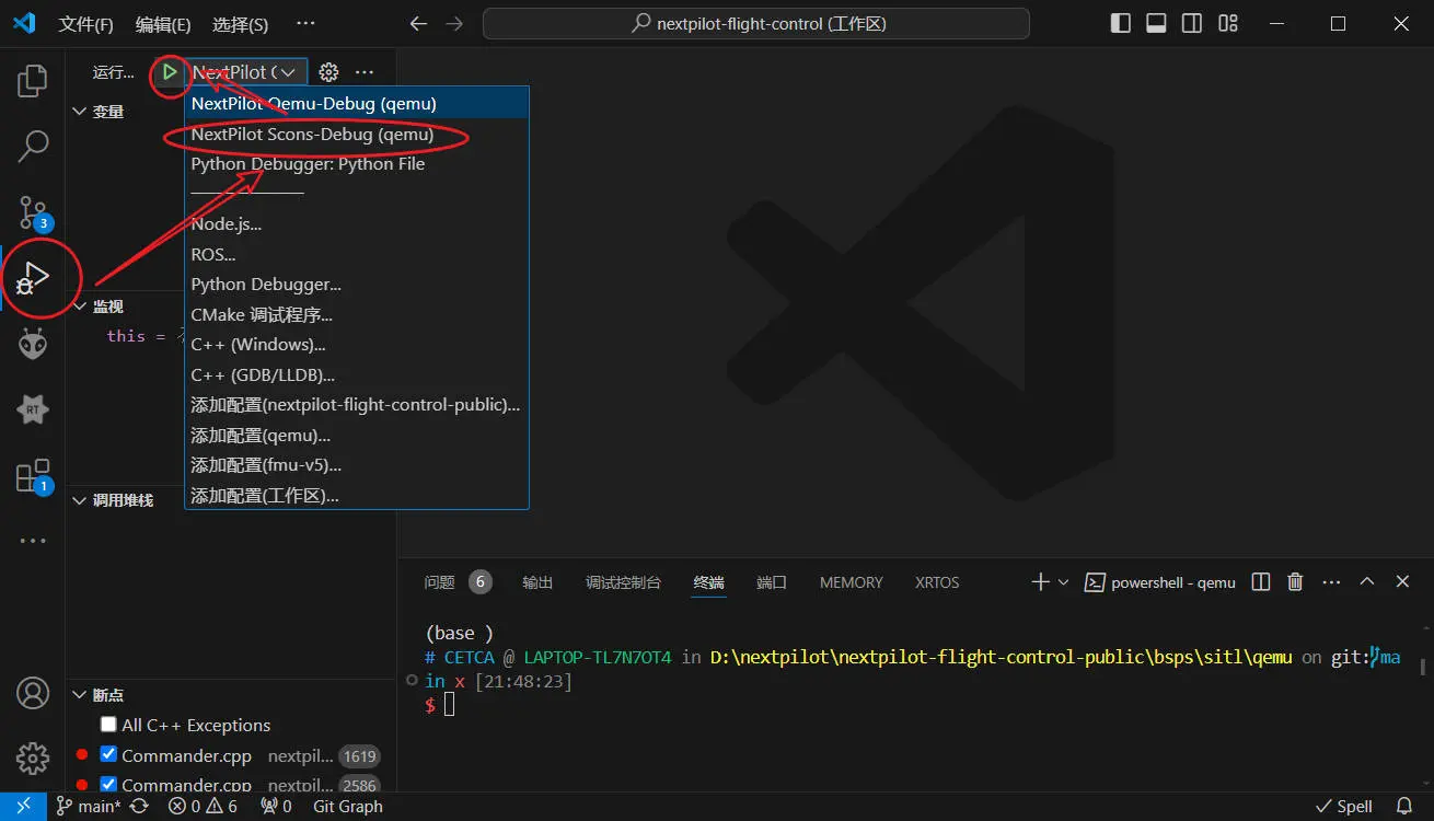 在左侧工具栏点击“运行和调试”标签,然后“运行...”下拉框中选择“NextPilot Scons-Debug”,再点击“三角形”运行“Scons-Debug”配置。