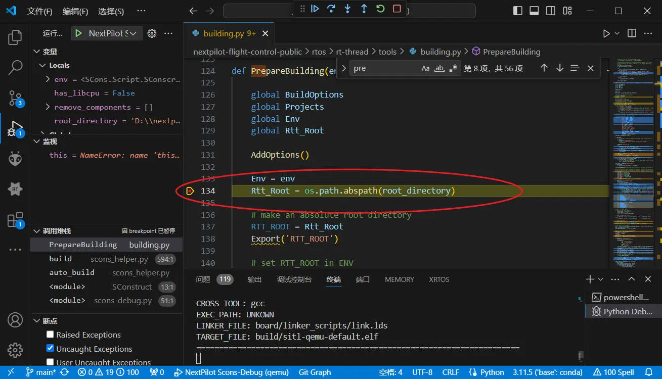 在rtos/rt-thread/tools/building.py文件(任何被SConstruct或SConscript调用的python脚本都可以)的PrepareBuilding()函数下面打个断点: