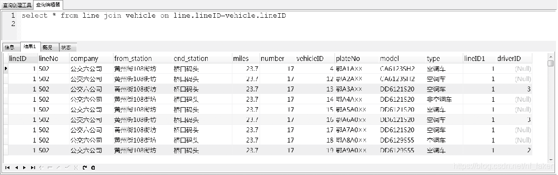 使用内连接获取所有的线路信息和车辆信息