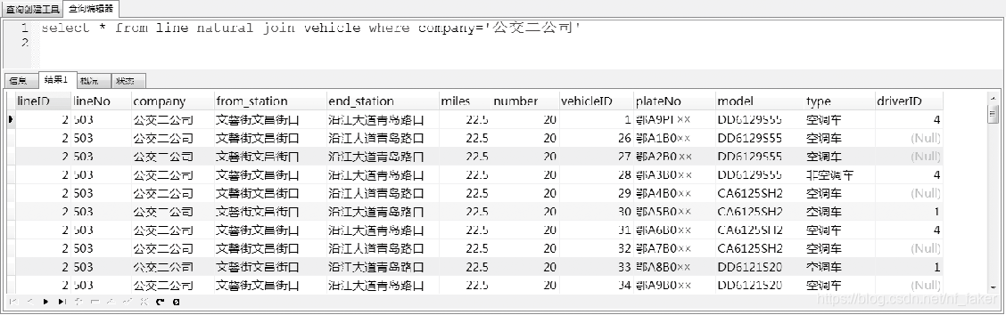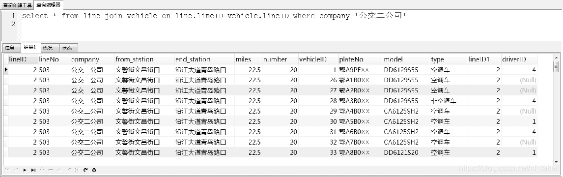 使用内连接获取公交二公司的线路信息和车辆信息