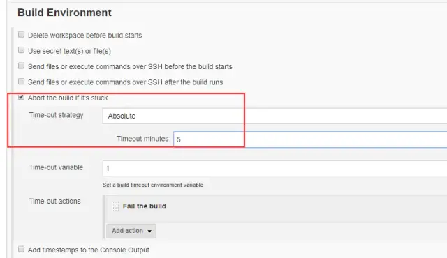 所以,我们需要设置构建超时时间来预防这种事情发生,一旦超过一定的时间,要让 Job 自动停止掉,如下: