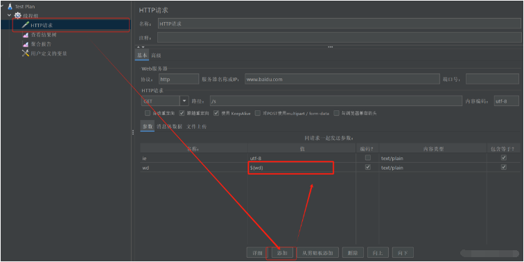 在HTTP请求中使用该参数,格式为 ${变量名称},即 ${wd}