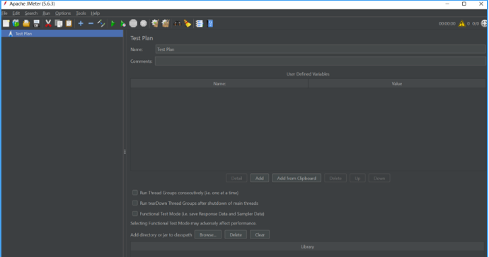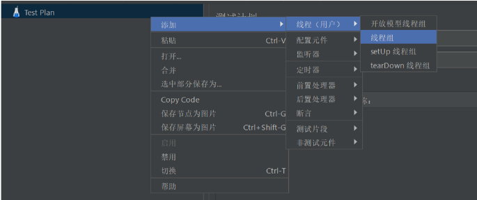 右键点击“Test Plan” -> 添加 -> 线程(用户) -> 线程组,可添加测试需要的线程组
