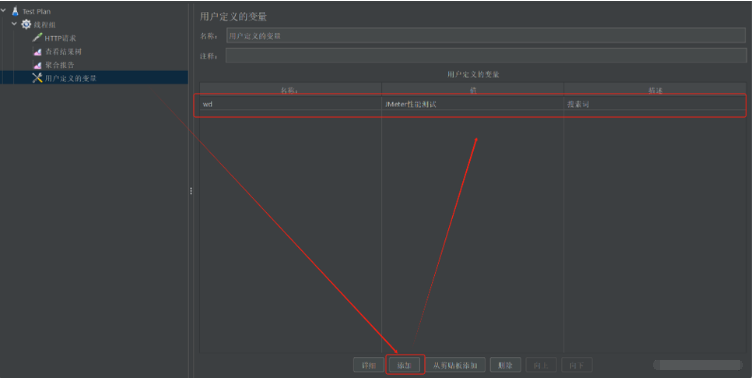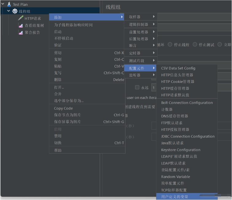 右键点击 线程组 -> 添加 -> 配置元件 -> 用户定义的变量,以添加用户自定义变量