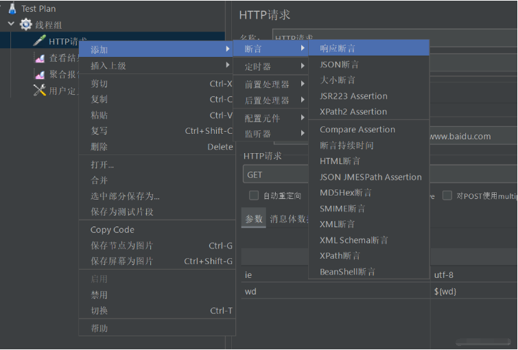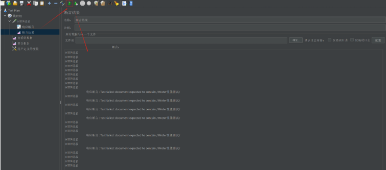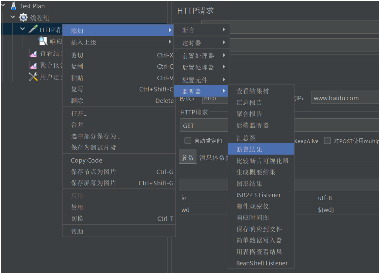 为查看断言的结果,在HTTP请求中添加断言结果:右键点击 HTTP请求 -> 添加 -> 监听器 -> 断言结果