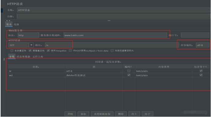 对网址 http://www.baidu.com/s?ie=utf-8&wd=jmeter 进行性能测试,参考下图进行配置