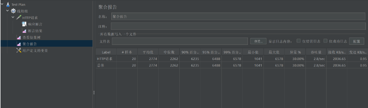 点击上方的绿色按钮,即可运行测试,性能测试执行完成后,可通过聚合报告看到测试结果。