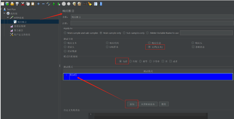 在HTTP请求中添加响应断言:右键点击 HTTP请求 -> 添加 -> 断言 -> 响应断言