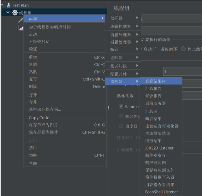 右键点击线程组 -> 添加 -> 监听器 -> 查看结果树,添加一个查看结果树