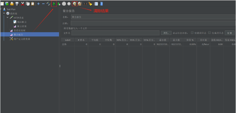 进入聚合报告,进行测试。测试之前需要点击上方的扫把按钮清楚之前的调试结果。