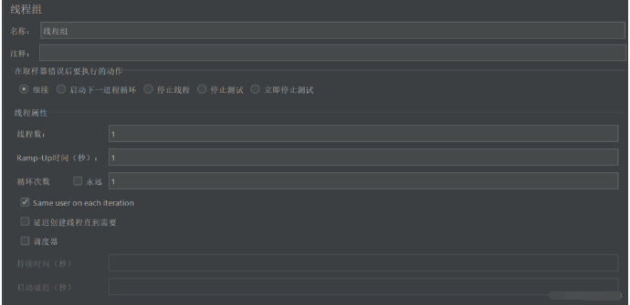 线程组可配置线程组名称、注释、线程数、Ramp-up时间、循环次数、调度器等参数