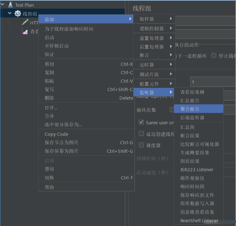 右键点击 线程组 -> 添加 -> 监听器 -> 聚合报告,用以存放性能测试报告
