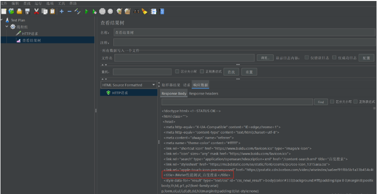 本次搜索返回结果页面标题为“JMeter性能测试_百度搜索”,与之前设置的发送参数相吻合。