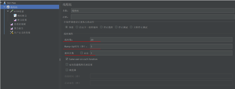 这里我们配置线程数为20,Ramp-Up时间为5秒,循环次数为1次。