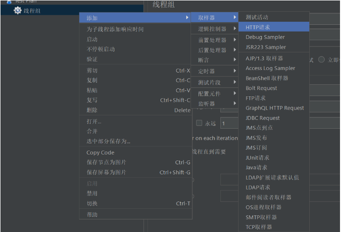 右键点击线程组 -> 添加 -> 取样器 -> HTTP请求,添加一个HTTP请求