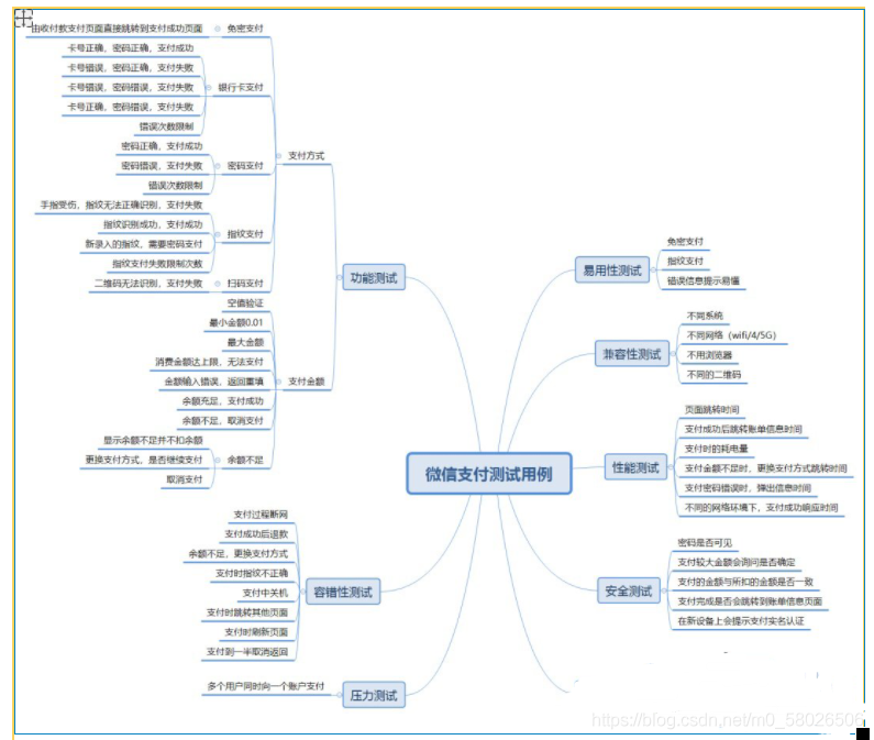 接下来就是测试方面的工作了,首先进行的是功能测试,那么我将边界值、等类划分、错误推测,因果图等各种测试方法相结合,整理出来了一套相对全面的测试案例,对支付功能进行测试,从而确保整个支付流程和涉及到的支付流程在任何情况下都能使用。