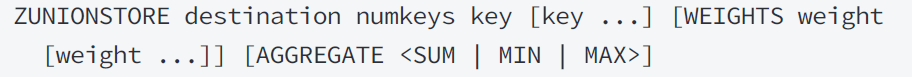 | zunionstore destination numkeys key [key ...] | O(n) + O(m * log(m)),n 是输入集合总元素个数,m 是目标集合元素个数 |