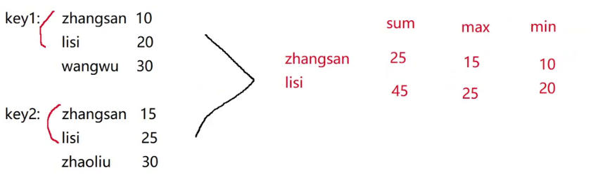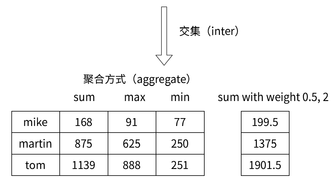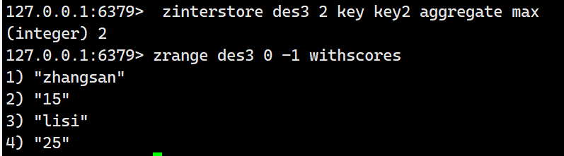 在进行zinterstore的时候, 如果是sum,那么具有相同member的就相加,如果是max,那么就去最大的,反之min就取最小的: