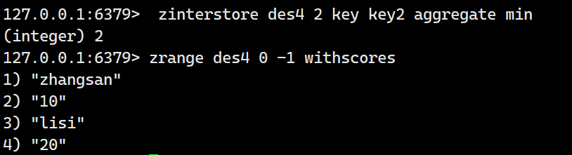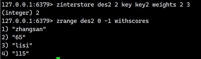 zinterstore desKey numsKeys key [key ... ] [weights weight [weight ... ]] [aggregate < sum | min | max>]