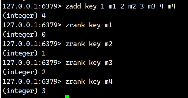 返回指定元素的排名,升序。降序版本命令为zrevrank, 其用法和zrank相同,这里不对zrank做过多的讲解。