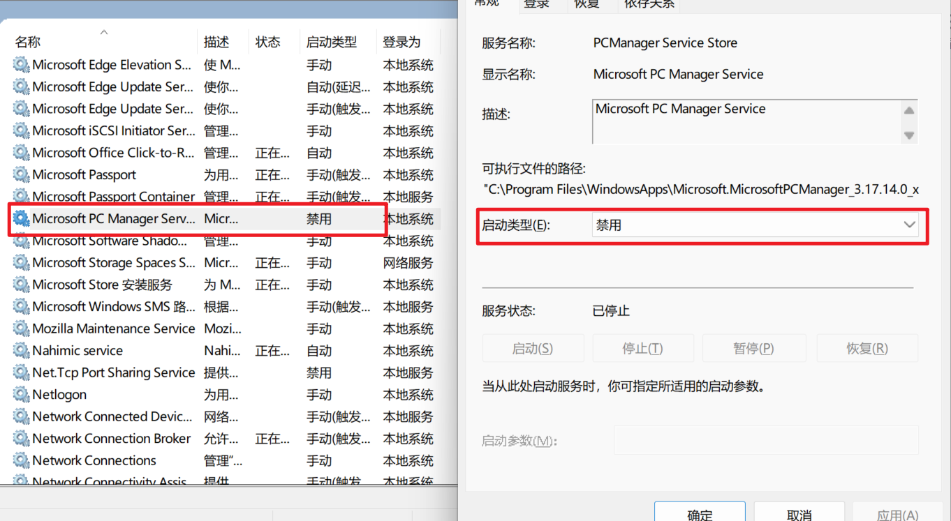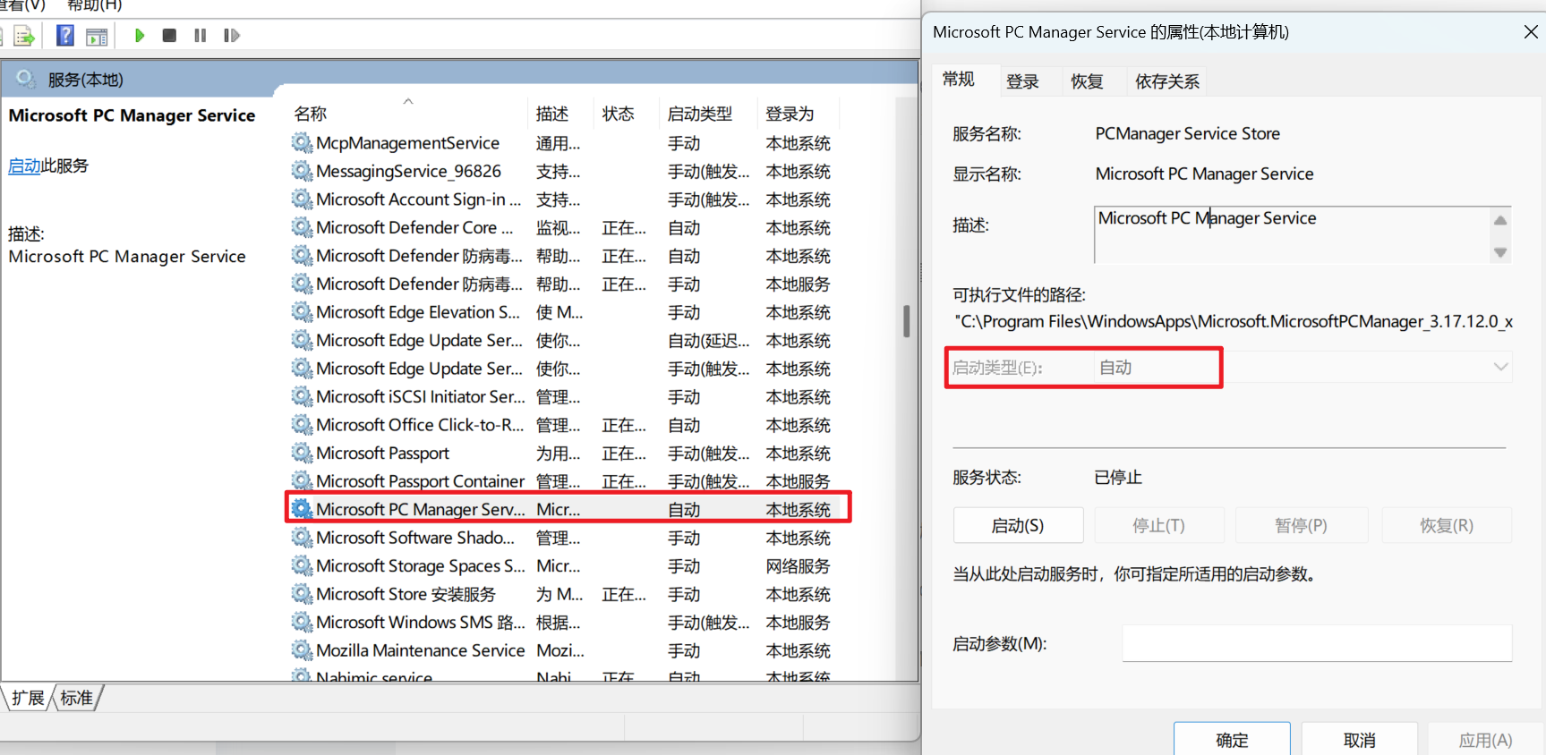 打算禁用该服务的自启动,运行 services.msc,找到 Microsoft PC Manager Service,把启动类型改成手动,发现这个服务禁止修改启动类型: