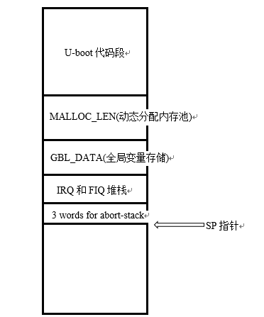 第183~190行,设置堆栈,CFG_MALLOC_LEN 、CFG_GBL_DATA_SIZE、CONFIG_STACKSIZE_IRQ、CONFIG_STACKSIZE_FIQ等宏在smdk2410.h中有定义,内存使用如下图所示: