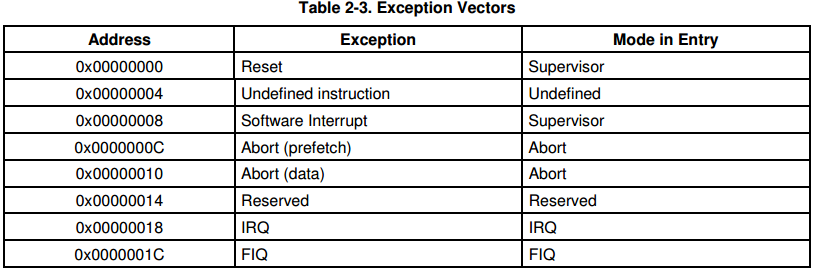 41 .globl _start 42 _start: b reset 43 ldr pc, _undefined_instruction 44 ldr pc, _software_interrupt 45 ldr pc, _prefetch_abort 46 ldr pc, _data_abort 47 ldr pc, _not_used 48 ldr pc, _irq 49 ldr pc, _fiq 50 51 _undefined_instruction: .word undefined_instruction 52 _software_interrupt: .word software_interrupt 53 _prefetch_abort: .word prefetch_abort 54 _data_abort: .word data_abort 55 _not_used: .word not_used 56 _irq: .word irq 57 _fiq: .word fiq 58 59 .balignl 16,0xdeadbeef